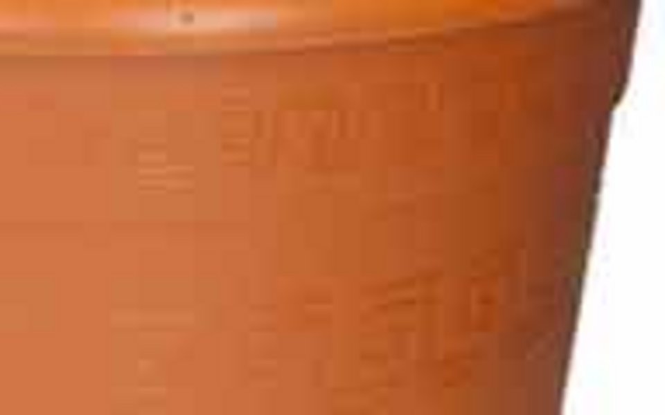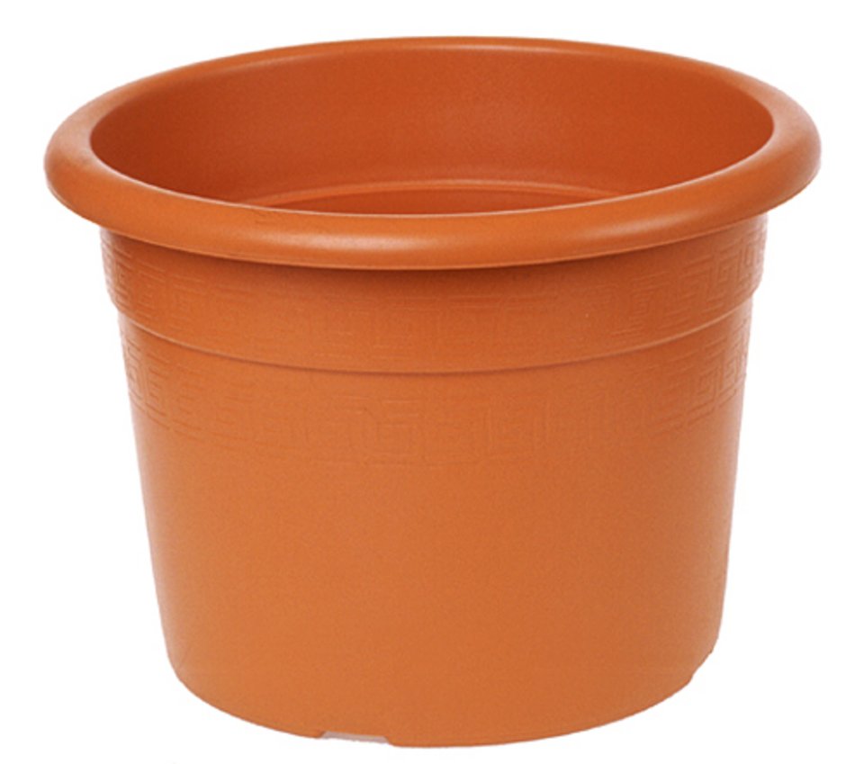 Conteneur déco en plastique robuste, résistant au gel et aux UV. En couleur terre cuite, avec trous au fond.