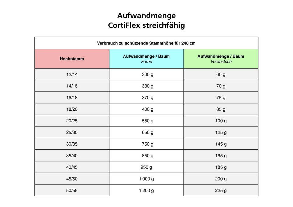 - Vous trouverez ci-dessous le tableau de quantité à appliquer : https://www.hortima.ch/fileadmin/user_files/Produktberater/Aufwandmengetabelle-Stammschutzfarbe-FR.pdf