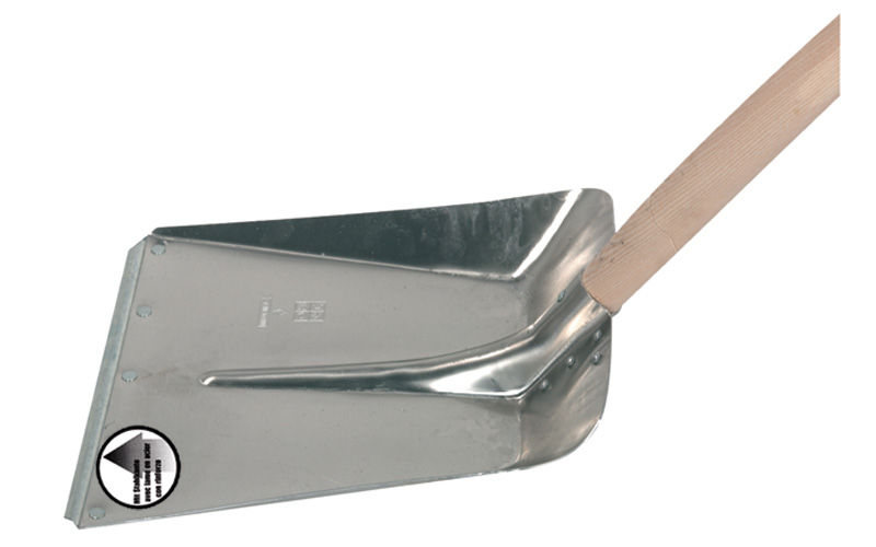 Pelle en aluminium trempé, brillante, avec lame en acier galvanisé, ribuste et manche en frêne.