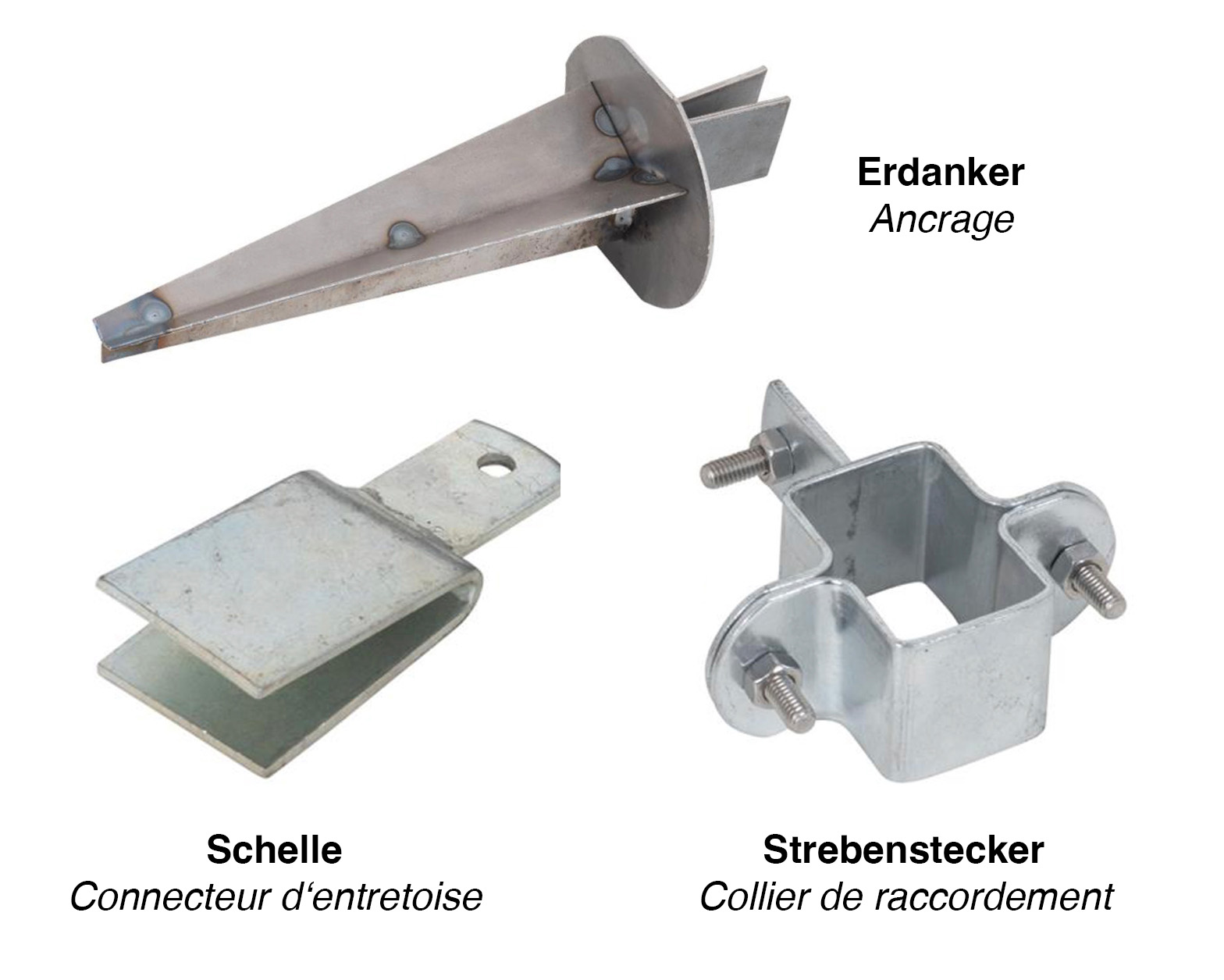 Le set comprend:AncrageCollier de raccordementConnecteur d?entretoiseCe kit d?accessoires permet d?utiliser un piquet métallique à profil Z comme barre de ren ...