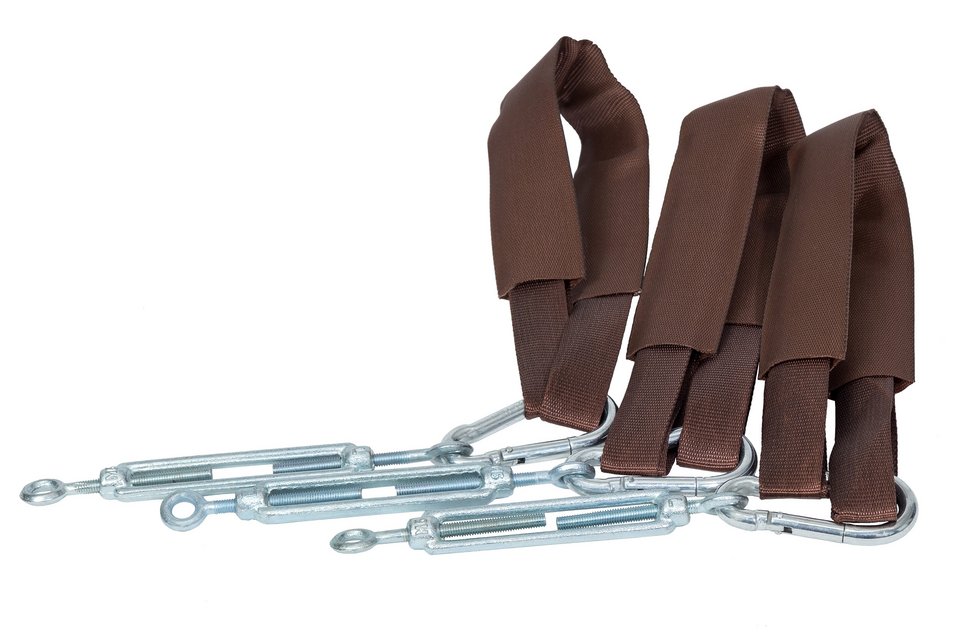 Das Set besteht aus: 3 Spannschrauben, 3 Gurtbänder mit Schutzschlauch und Karabinerhaken.
