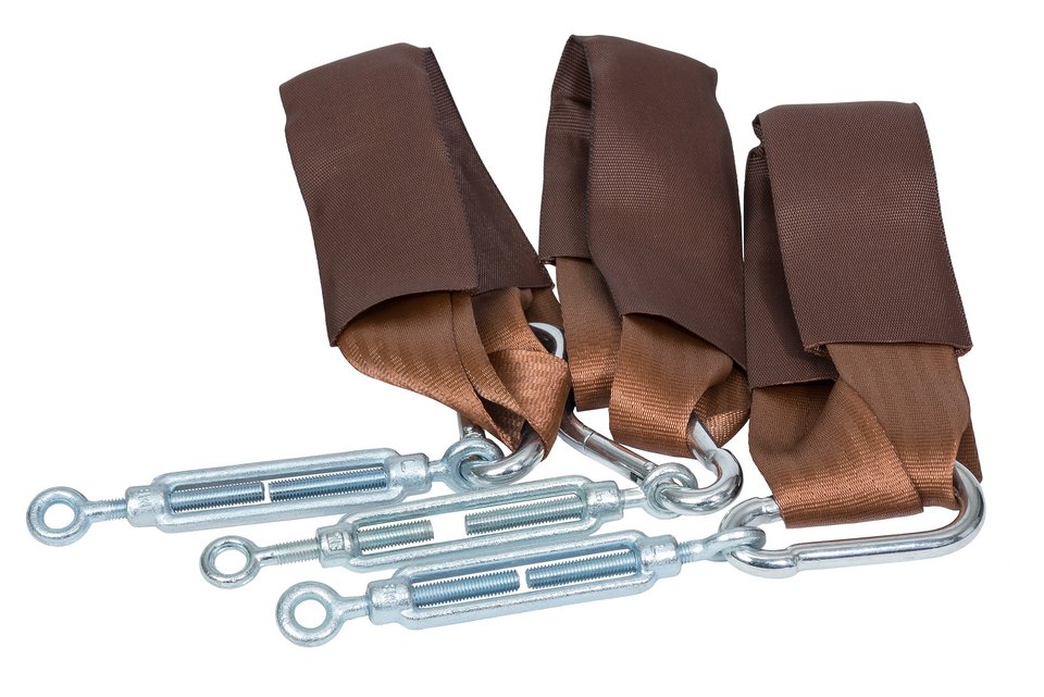 Das Set besteht aus: 3 Spannschrauben, 3 Gurtbänder mit Schutzschlauch und Karabinerhaken.