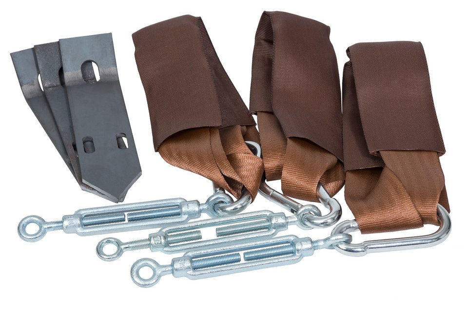 Im Set enthalten sind: 3 Anker, 3 Spannschrauben, 3 Gurtschlaufen mit Schutzschlauch und Karabiner.