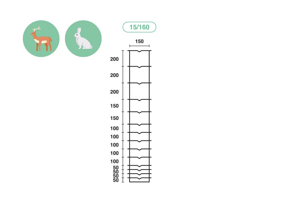 Abstand der Querdrähte 15 cm Draht-Ø oberster und unterster Längsdraht 2.5 mm Draht-Ø übrige Drähte 2.0 mm Wichtiger Hinweis: Knotengitter sind einfach zu montieren sämtliche Längsdrähte spannen Spanndraht überflüssig