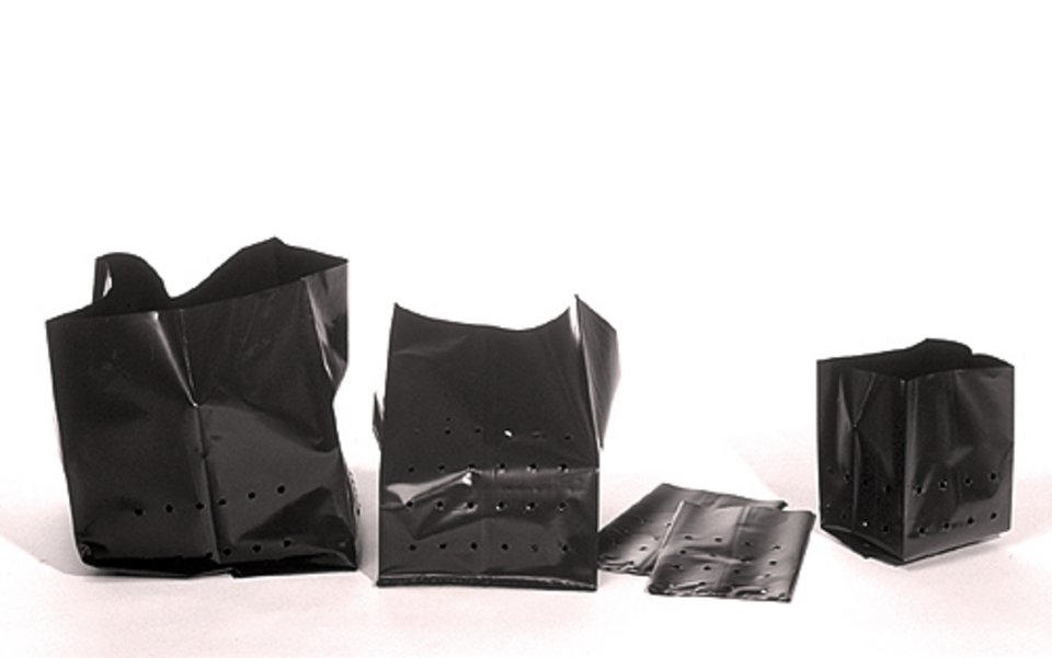 Gelochte, schwarze Pflanzenbeutel aus LDPE-Kunststoff.