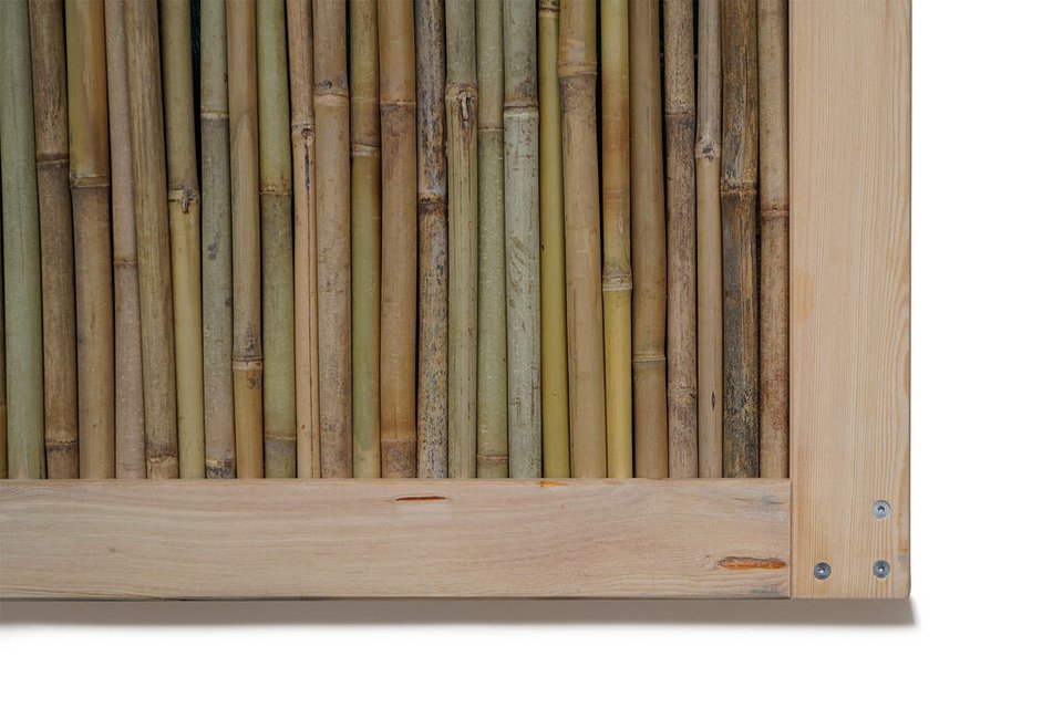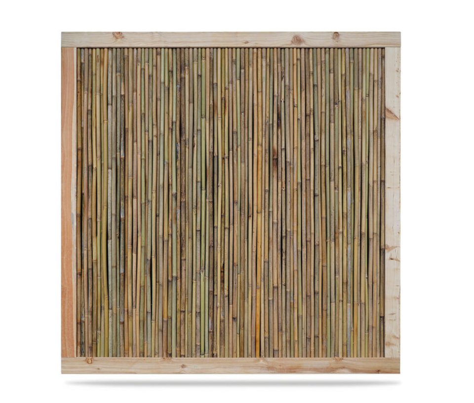 Sichtschutzwand aus naturbelassenen, runden Bambusstäben mit einem umlaufenden Lärchenholzrahmen, 120 x 180 cm.