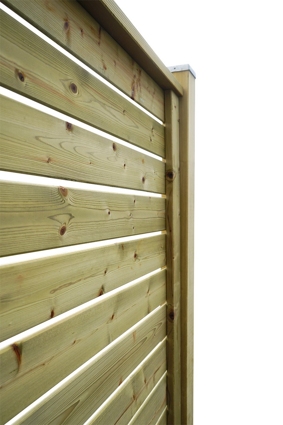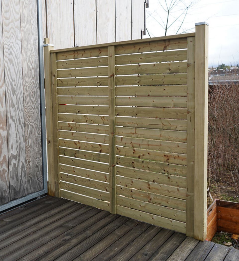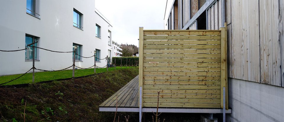 «Norma» stilvolle Sichtschutzwand mit dezent aufgeschraubten Lamellen für subtilen Blickdurchlass.